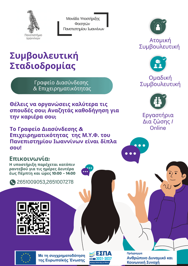 Μονάδα Υποστήριξης Φοιτητών Διεύθυνση Εκπαίδευσης Πανεπιστήμιο Ιωαννίνων – Συμβουλευτική Σταδιοδρομίας
