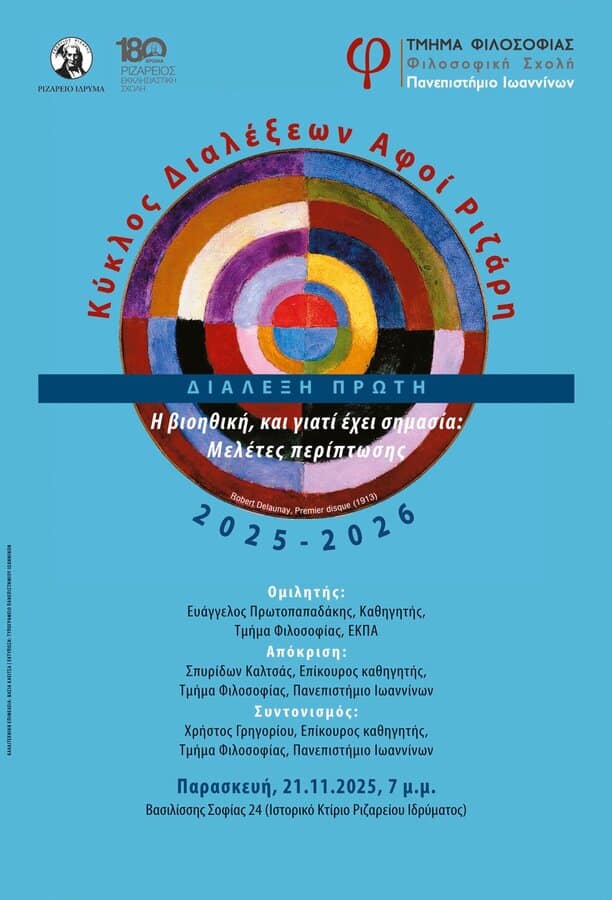Από το ακαδημαικό έτος 2021-2022, το Τμήμα Φιλοσοφίας διοργανώνει σε συνεργασία με το Πνευματικό Κέντρο του Δήμου Ιωαννιτών δύο ετήσιες δράσεις φιλοσοφικού περιεχομένου που απευθύνονται στο κοινό της πόλης αλλά και στους/στις φοιτητές/τριες και την πανεπιστημιακή κοινότητα εν γένει. Από το ακαδημαϊκό έτος 2022-2023, οι δύο δράσεις ενισχύονται χορηγικά από το Ίδρυμα της Ριζαρείου Εκκλησιαστικής Σχολής.